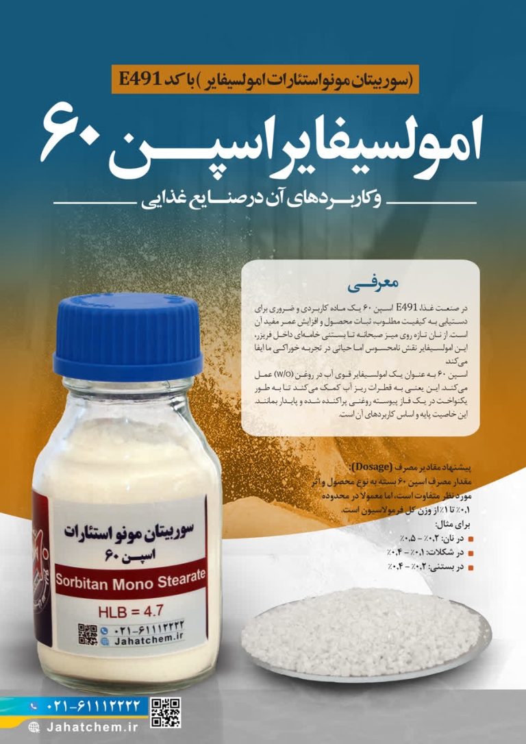 سوربیتان مونواستئارات با کد E491 یک امولسیفایر تخصصی و کاربردی برای دستیابی به کیفیت برتر، ثبات ایدهآل و افزایش ماندگاری محصولات غذایی است. از نان تازه روی میز صبحانه تا بستنی خامهای در فریزر، این ماده نقش حیاتی در تجربه غذایی شما ایفا میکند.