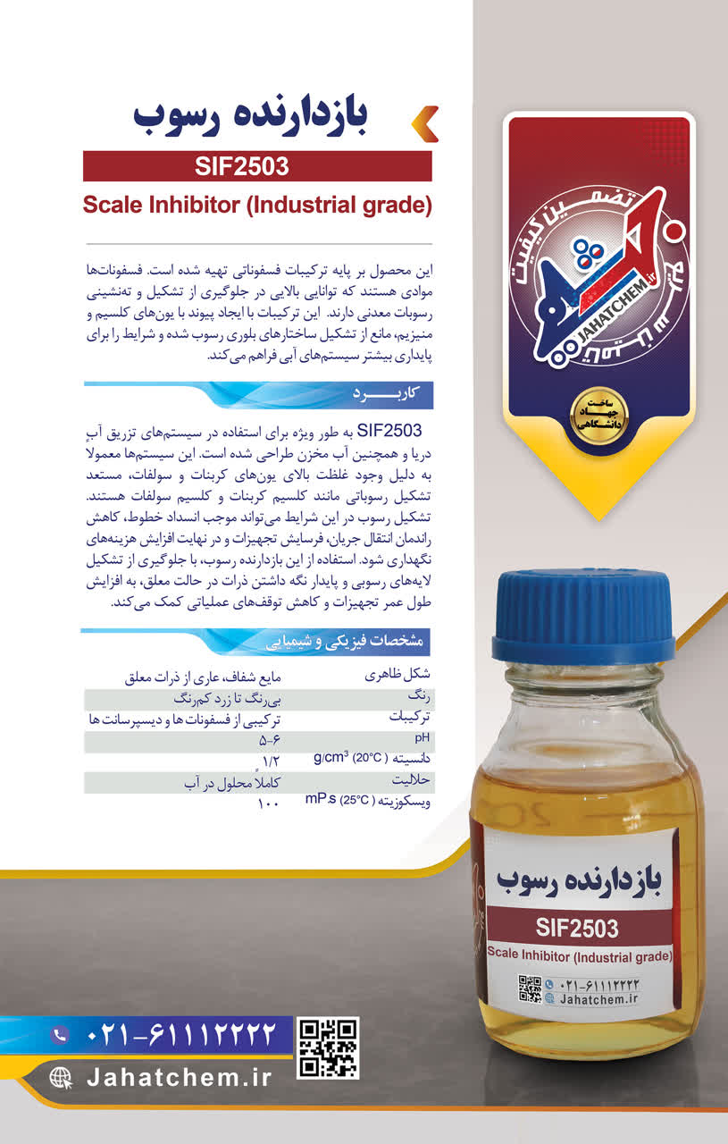 بازدارنده رسوب SIF2503 یک ماده صنعتی بر پایه ترکیبات فسفوناته که برای جلوگیری از تشکیل و رسوبگذاری املاح معدنی مثل کلسیم و منیزیم در سیستمهای آبی طراحی شده.